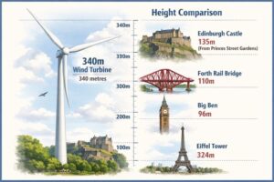 For comparison, the MachairWind turbines would be taller than any building in Europe excluding Russia. A 340 m turbine is higher than the Eiffel Tower (324 m) – and almost exactly equivalent to Big Ben (96 m) on top of the Forth Road Bridge (110 m) on top of Edinburgh Castle (135 m) (total 341 m).